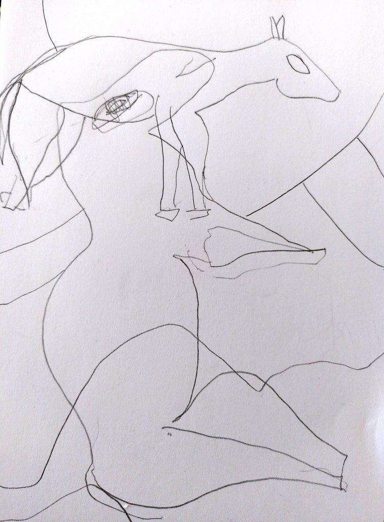 Le crayon a retrouvé sa feuille de papier habituelle, mais il a fort envie de s’émanciper. Écrire des mots les uns à la suite des autres, attendre que monsieur Nuit les disloque, les digère et leur permette de doucement descendre, se sédimenter, ou partir dans la danse de la rivière à n’en plus finir. Le crayon veut aller plus vite et le crayon s’invente un nouveau langage lui aussi, comme le pinceau. Il sait qu’il parlera tout autant en dessinant le labyrinthe de ses oreilles, que toute voix est bonne pour qui cherche à entendre, et que le monde n’a pas d’entrée ou de sortie où quelqu’un puisse parvenir en se criant vainqueur.